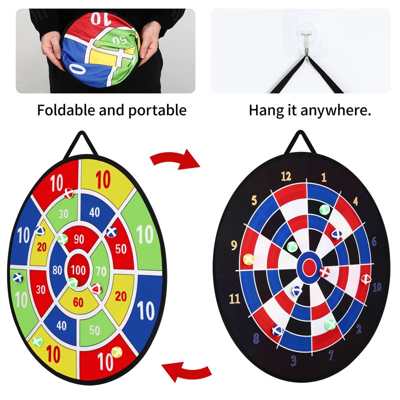 - Rich accessories: children's dartboard set includes 1 double-sided dartboard with a diameter of 29 inches, 12 darts, 12 rubber balls and 2 hooks, foldable design for easy transport and storage.