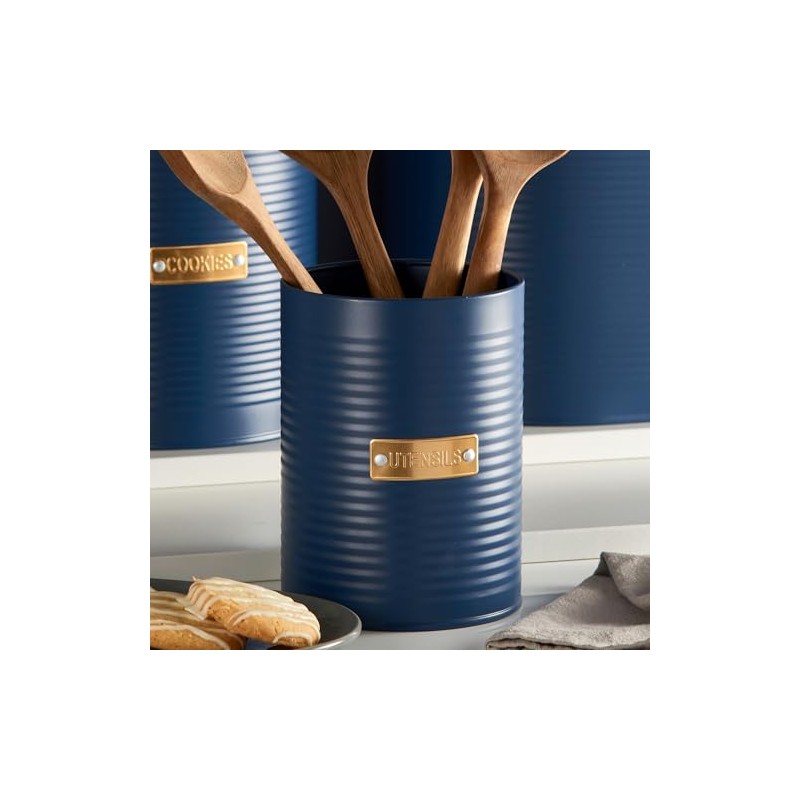 - Stylish Utensil Holder – Navy blue metal storage pot with a ribbed design and gold-tone badge for a sleek kitchen look.