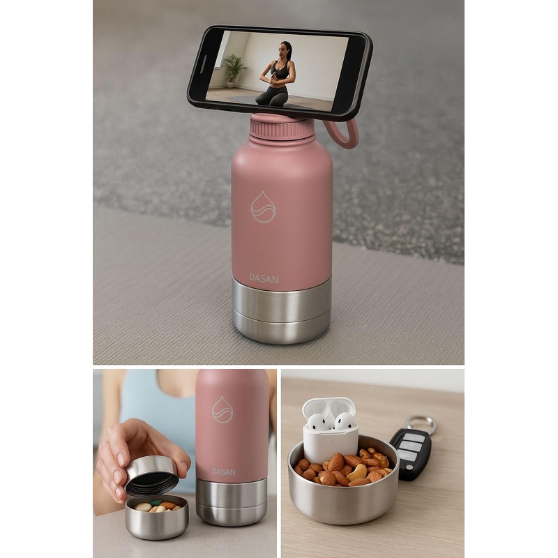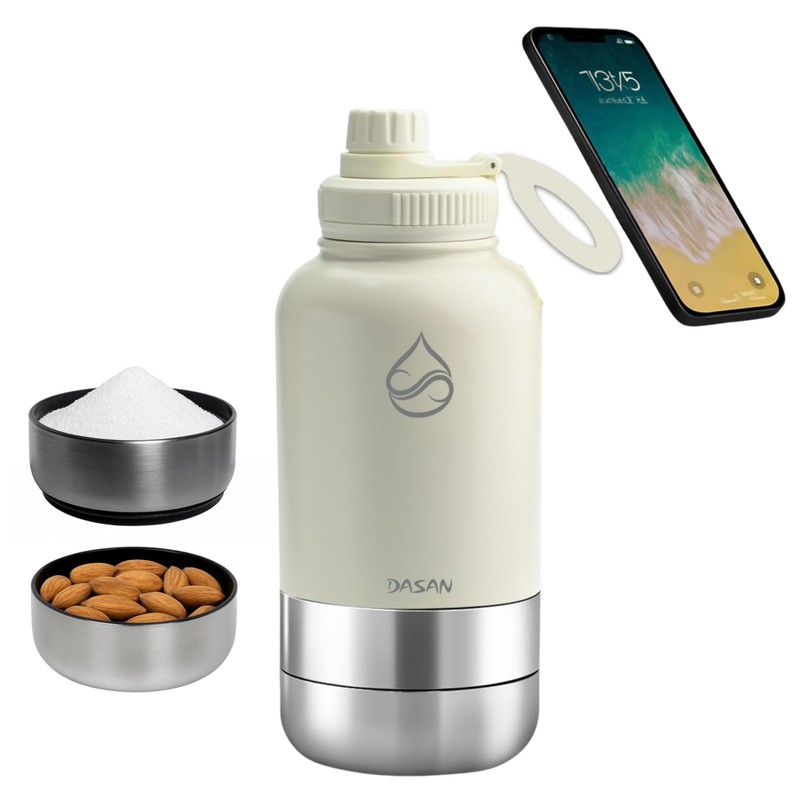 - DASAN water bottle with magnetic phone holder, keeps up your phone securely mounted for meetings, calls, content creation, watching workout videos, taking selfies. Compatible with all devices, includes a magnetic booster ring to ensure secure attachment with any phone model. Value for money, sturdy and durable design. Enjoy total flexibility with the built-in MagSafe tripod mount, rotate your phone 360° and tilt 90° to capture the perfect angle, even when your bottle is empty. Effortlessly switch between portrait and landscape modes.