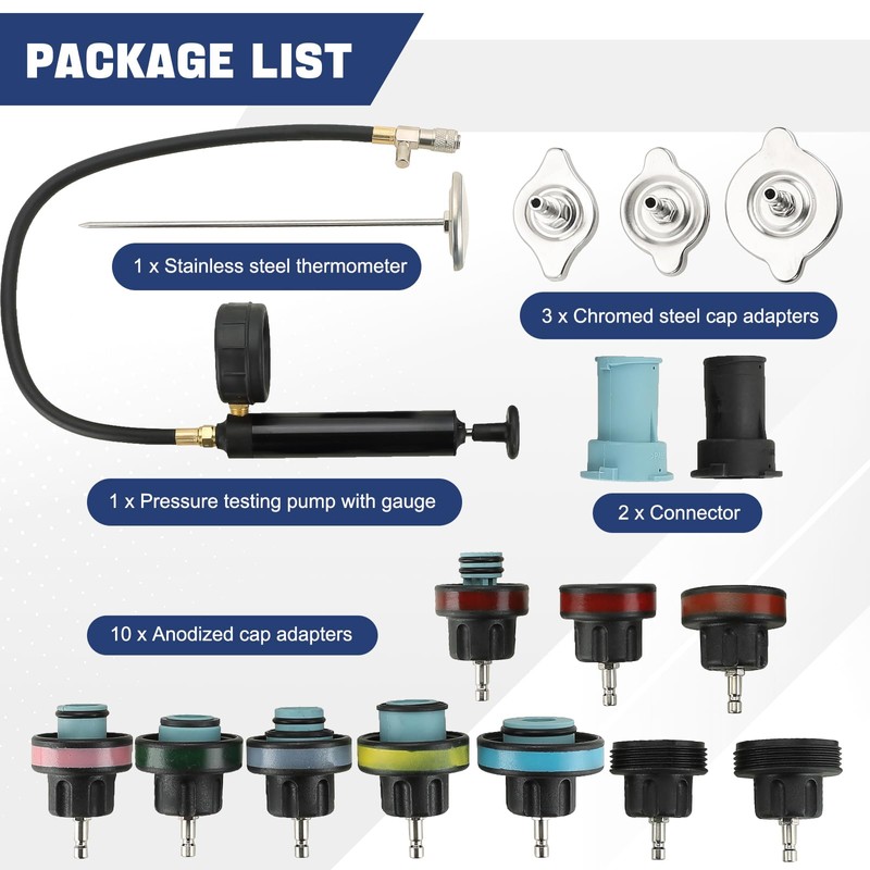 - Package Included: 1 x Pressure testing pump with gauge 1 X Thermometer 3 X Chromed Steel Cap Adapters 10 X Anodized Cap Adapters ; 2 x Connector; 1 x Adapter Handle; 1 X Carrying Case