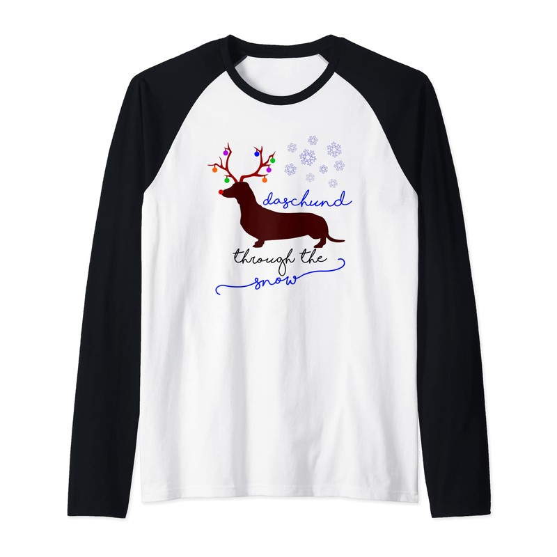 - Dachshund through the snow by plunging through the snow with this festive fun Christmas themed t-shirt. Perfect for hot dog lovers and sausage dog lovers, especially animal lovers. Enjoy this reindeer inspired dachshund dog tee during the Christmas holiday