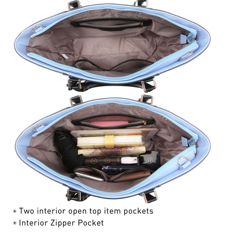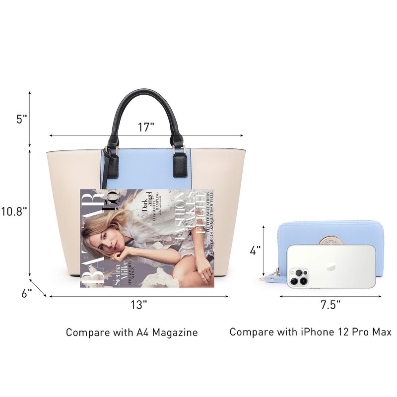 - Design: Women fashion two-tone tote bags with a matching clutch and a fashion tassel. Detailed with top zip closure, gold-tone hardware, and bottom studs. It can be used as a tote bag, daily purse, shoulder bag, top handle bag, work bag, laptop bag, etc.