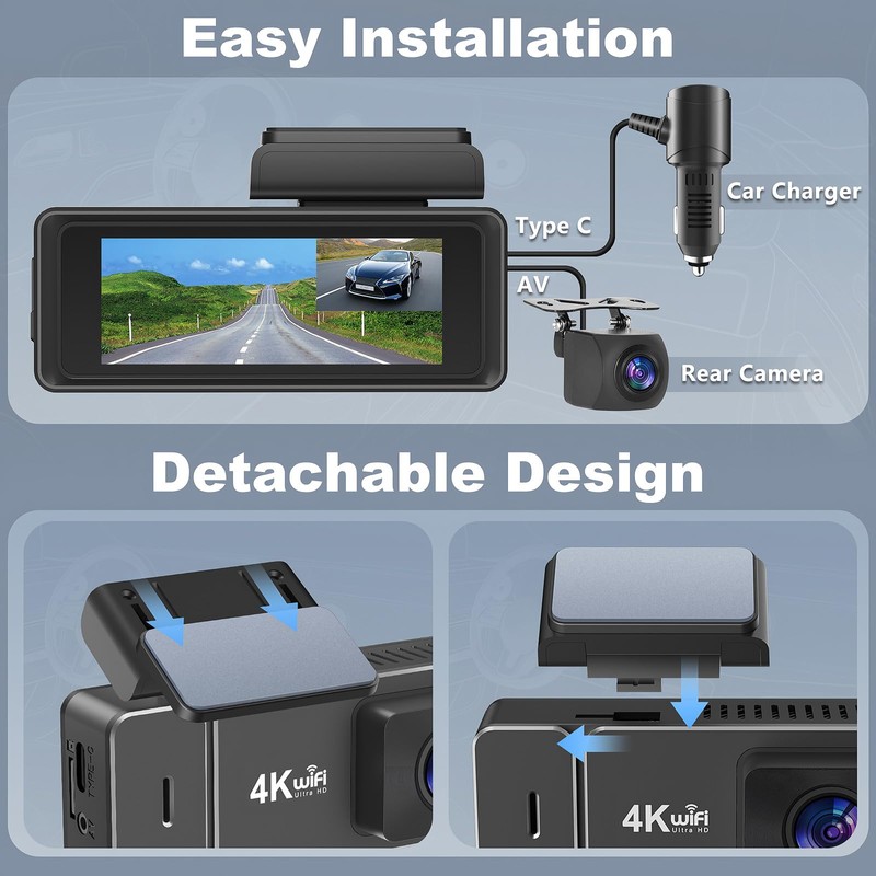 - 【Mini Hidden Design & Easy to Install】 The delicate design of the 4K dash cam can be easily mounted on the windscreen without obstructing the driver's view, 2.99 inch IPS display clearly shows dashboard camera's status and function switches. With the included pry tool and 3M sticker mount , the cable of dash cam is very easy to hide and car dash cam front and back is easy to attach and remove, no need to worry even for a first time user.
