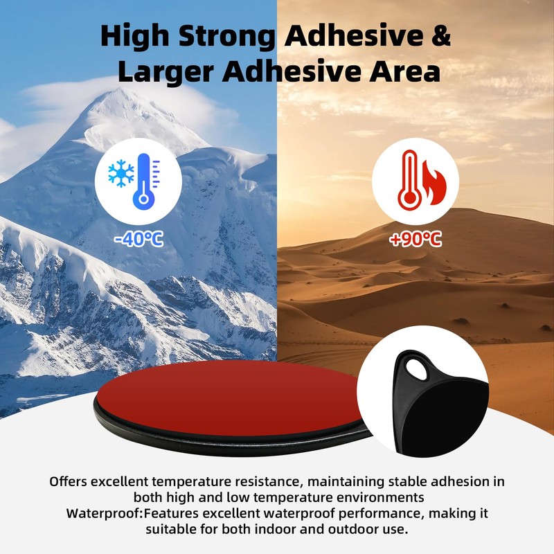 - Strong Sticky Adhesive:Thanks to premium strong adhesion adhesive,This Strong viscosity sticky discs plate can hold securely for heavy duty mount dash,The stickiness of the powerful sticking discs is stronger ,40 % higher than ordinary two sides sticky glue gel.waterproof. High temerature resistant.can hold up to high temperature(120 °C). Designed to be persitent in Florida Louisiana Georgia Texas to withstand hot summer, secure your das cameras without worry.