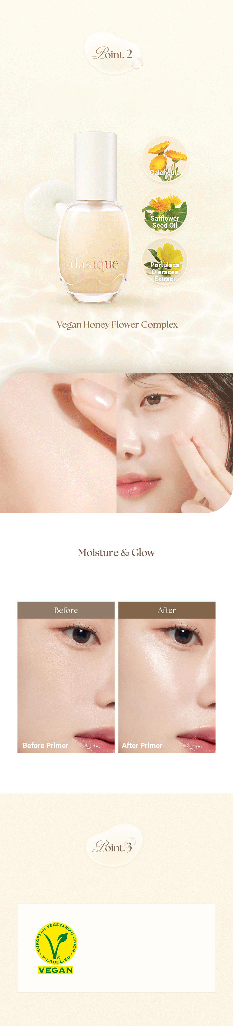 The vegan flower water texture (calendula, Carthamus Tinctorius (Safflower) Seed Oil, Portulaca Oleracea Extract) provides boosting effect to skin moisture layer to maintain optimal skin condition before makeup.