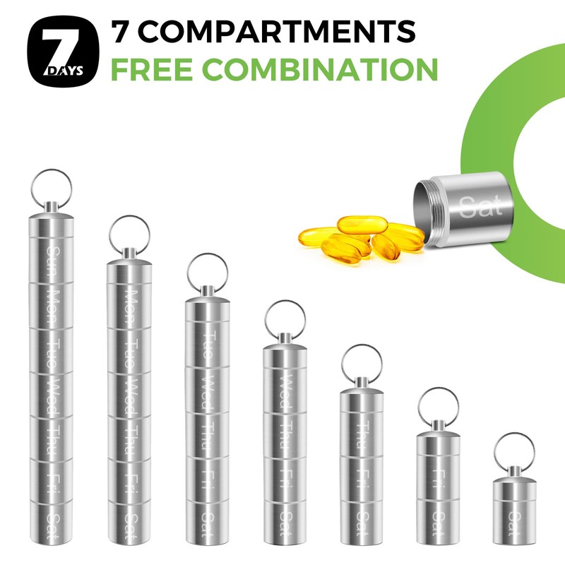 - Aluminium alloy pill box: Our pill box is made of high-quality aluminium alloy, it is durable and rust-proof, with a total length of 7.4 inches, an outer diameter of 1 inch, each compartment is 0.8 inches deep and an inner diameter of 0.8 inches.