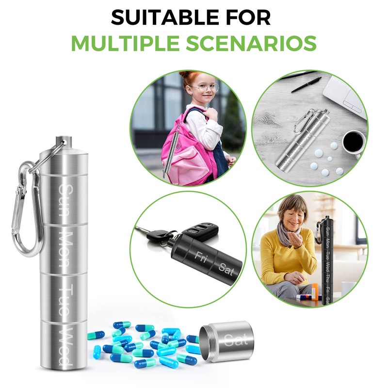 - Exquisite appearance, privacy protection: the pill box is designed with 7 metal compartments with engraved initials of the week, perfect for carrying small items such as pills, memory cards, earrings, rings, etc. It is a great way to protect the privacy of your belongings.