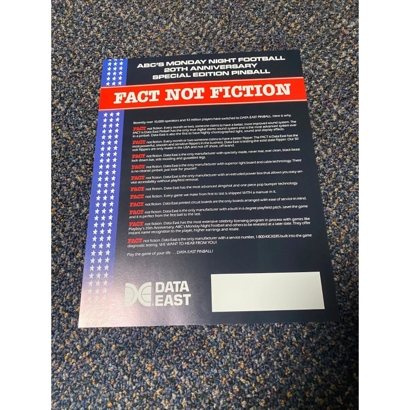 YOU ARE BUYING A 1989 DATA EAST MONDAY NIGHT FOOTBALL PROMO FLYER . THE FLYER HAS BEEN IN A FILE CABINET SINCE 1989 BUT MAY SHOW A FEW MINOR MARKS FROM STORAGE AND HANDLING.
