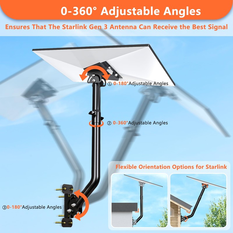 - Freely Adjust the Installation Angle Starlink Mount:①The base on the connecting rod can adjust angle from 0-180° to maximize signal reception;②The pole connected to the Gen 3 pipe adapter can be 0-360° rotated to adjust the direction of the Starlink antenna; ③The base under the connecting rod can adjust angle from 0-180°, which helps ensure precise positioning and prevents Starlink Gen3 from colliding with the wall.Ensures That The Flexible Orientation Options for Starlink.