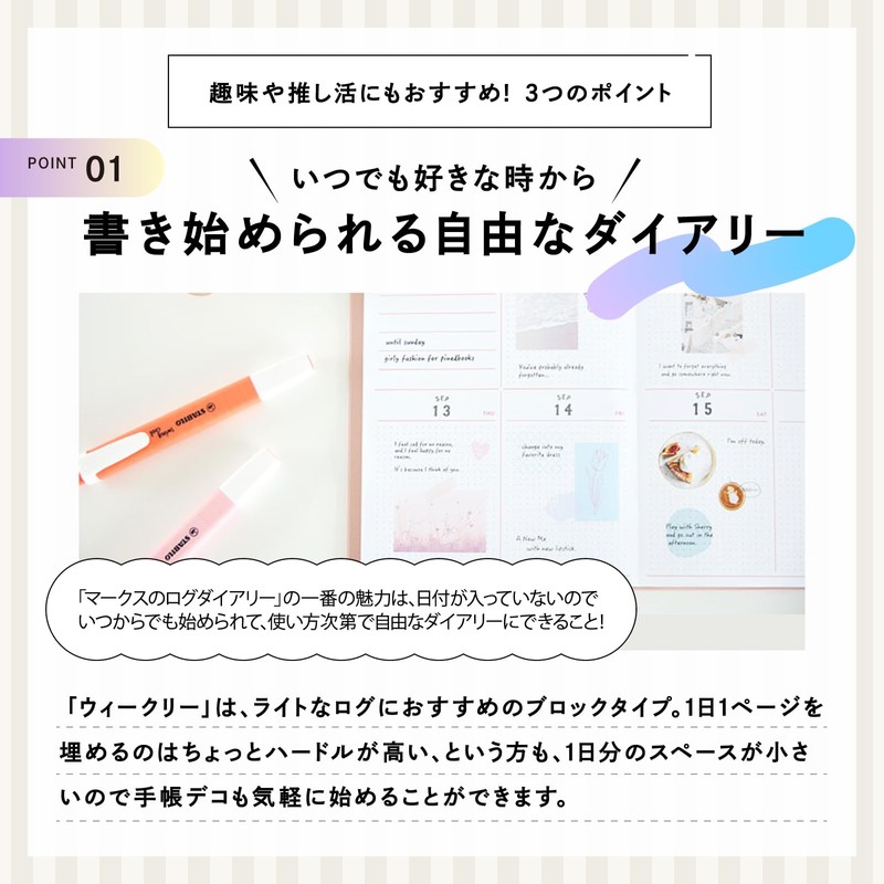 Weekly block type recommended for light logs. Even those who have a little hurdle on one page a day, can start with ease. Since it is free of dates, it is easy to start even for those who are unsure whether they can continue daily.