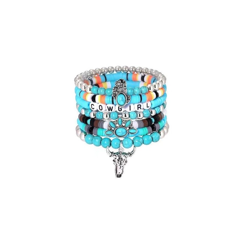 DATOA Western Turquoise Beaded Stretch Bracelet Bohemian Bull Head Cow Cactus Flower Boot Charm Stackable Bracelet Y2K Summer Beach Jewelry-B