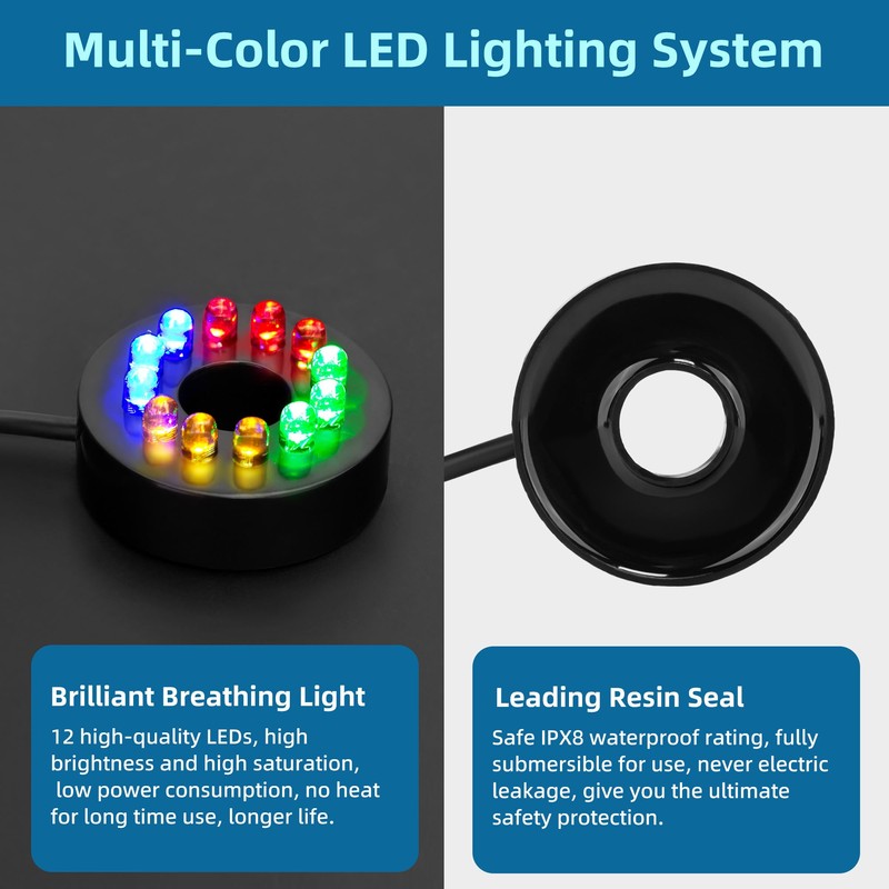- 【Multi-color LED Lighting System】: DaToo Small Water Pump has 12 high-quality LED light beads, high brightness and low power consumption, no heat up for long time use, longer life. Light adopts breathing light effect with brilliant colors and high saturation, create dynamic and charming underwater light and shadow. Leading epoxy resin sealing technology, safe IPX8 waterproof rating, can be completely submerged in water to use, never electric leakage, give you the ultimate safety protection.