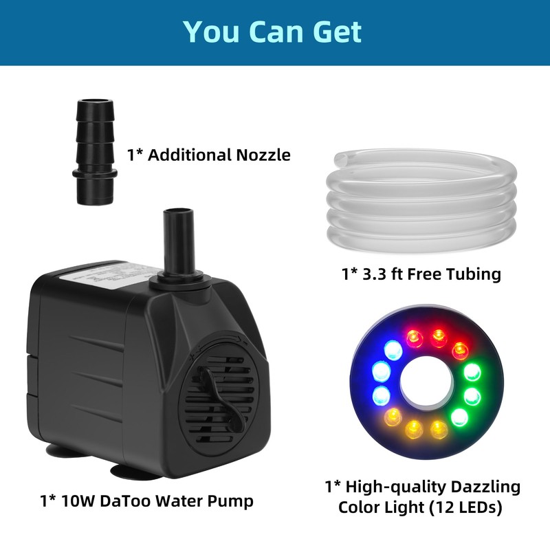 - 【DaToo Fountain Water Pump With LED Light】: Light up your water feature and enjoy perfect combination of serenity and beauty -- a perfect choice for your ideal water feature design. DaToo Water Pump has high-quality powerful motor, strong and adjustable water flow, brilliant LED lighting effects, mini size, very quiet operation, easy install and maintain, give you superior experience and visual enjoyment. Be it for aquarium, fountain, or pond, DaToo can easily fulfill your needs!