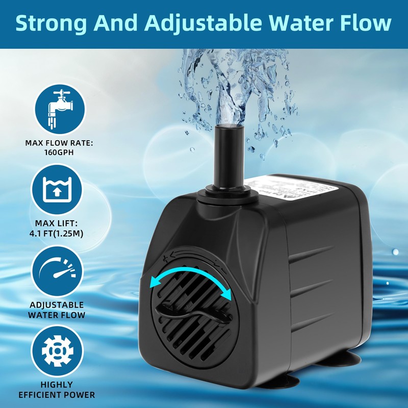 - 【Strong And Adjustable Water Flow】: DaToo Submersible Water Pump has 3W high-quality powerful motor with maximum water flow up to 160GPH, supports up to 4.1ft of water flow height. Highly efficient power output provides you with a consistent and strong flow of water continuously. You can also change flow rate of DaToo fountain pump by moving adjustment rod, four flow options in total, very convenient. Whether gentle flow of water or powerful fountain effect, can be easily realized.