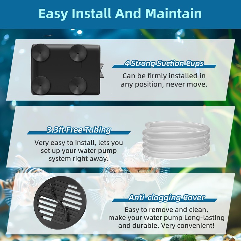 4. Easy Install And Maintain: There are 4 strong suction cups to ensure firmly installed and never move. A 3.3ft free tubing, easy to install, lets you set up your water pump system right away. Anti-clogging cover, very easy to remove and clean.