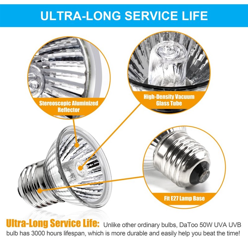 - SCIENTIFIC HEAT SOURCE : DaToo 50W UVA UVB bulbs not only provide warm heat for your reptile, but it also provides them with 97% UVA and 3% UVB to simulate sunlight exposure. (WARM HEAT: Raises your pet's body temperature and improves blood circulation. 97% UVA: Promotes metabolism and food absorption. 3% UVB: Promotes calcium absorption and bone growth). All for the scientific and healthy growth of your lovely pet.