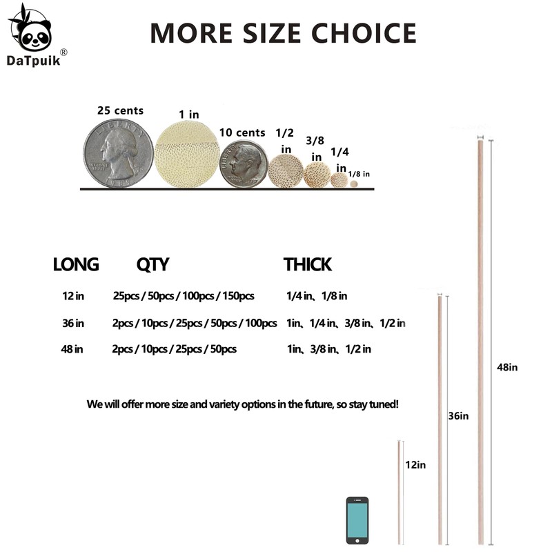 • 1. Size: bamboo dowel rods long 12inch, diameter 1/4inch. Package Includes: 25Pcs bamboo dowel rods.