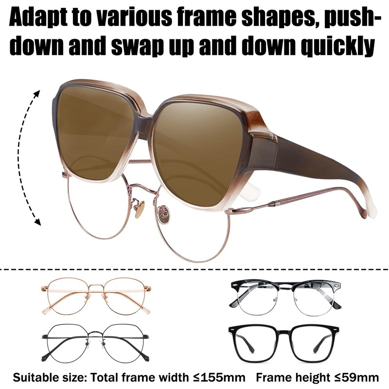 • OVER GLASSES SUNGLASSES: The polarized sunglasses are specially designed for those who wear regular / prescription glasses, easily wear over existing glasses (frame length within 155mm & frame height within 59mm), people with normal vision can also wear them alone.