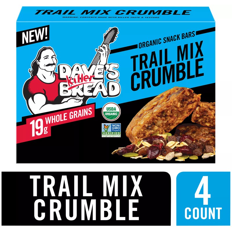 Baked with organic chocolate chunks, fruit, and seeds, Dave's Killer Bread® Trail Mix Crumble Organic Snack Bars deliver all of the flavor while packing the whole grain nutrition you expect from Dave's Killer Bread. Individually wrapped for an on-the-go snack or breakfast, Trail Mix Crumble bars are USDA organic and baked with a killer mix of chocolate, fruit and seeds. 5g fiber per bar. Plus, each Non-GMO Project Verified, USDA organic snack bar includes 19g of whole grains and is sure to take your breakfast to the next level. Dave's Killer Bread Bars have no high fructose corn syrup, no artificial preservatives and no artificial ingredients. You can trust Dave's Killer Bread to deliver killer taste, texture and whole grain nutrition. Trail Mix Crumble Organic Snack Bars are like your favorite trail mix featuring chocolate, fruit and seeds with a hearty serving of whole grains.The story of Daves Killer Bread began at the Portland Farmers Market, when Dave Dahl and his nephew brought some loaves of Dave's bread to sell. For Dave, this marked the beginning of a new chapter in his life. Though he grew up in a family of bakers, his life took a different path. A path that landed him in prison for 15 years. Determined to prove his worth and make a positive impact, Dave worked tirelessly to bake breads that tasted unlike anything else on the market ” packed with seeds and grains, made with only the very best organic and Non-GMO Project Verified ingredients. Daves Killer Bread believes everyone is capable of greatness. One in three of the company's employee partners at their Milwaukie, OR bakery has a criminal background”but your past doesn't define your future. As a proud Second Chance Employer, Daves Killer Bread truly believes everyone deserves a second chance to become a Good Seed.