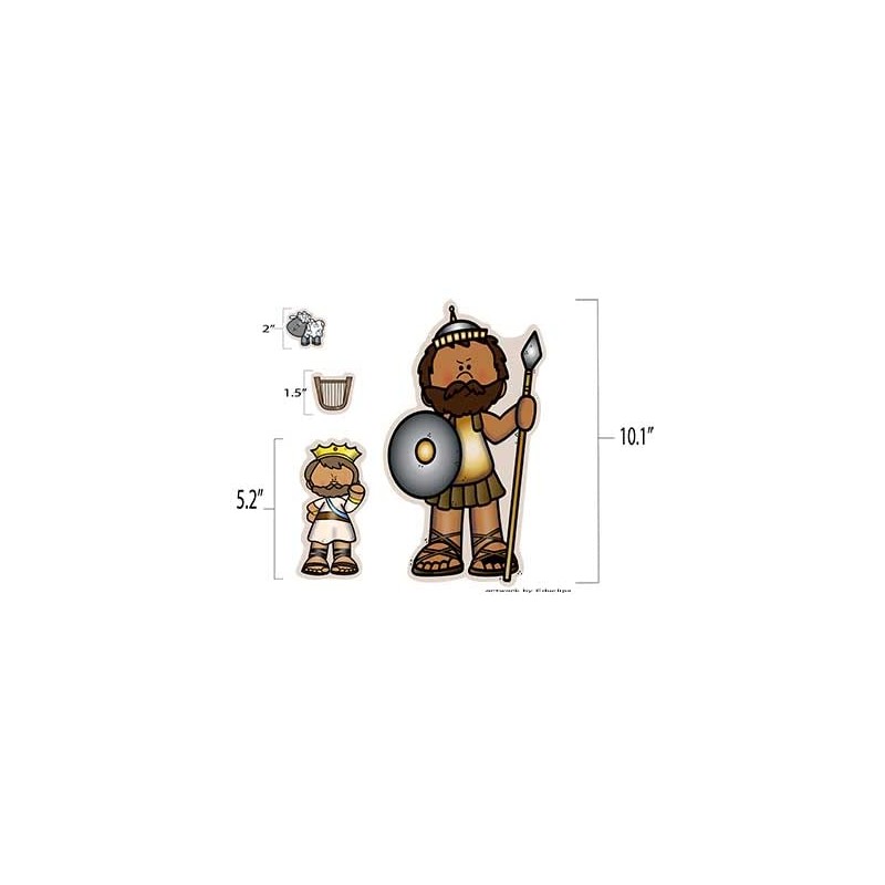 Size estimates: Goliath 10.1", King Saul 5.2", smallest sheep 2", harp 1.5"