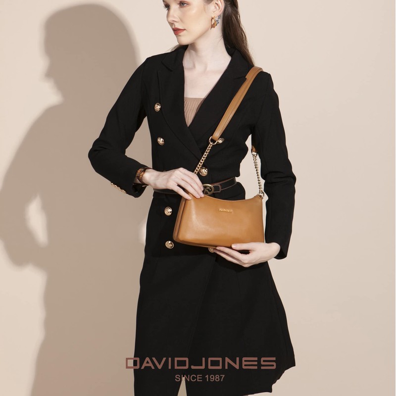David Jones - Women's Small Chain Crossbody Bag - Ladies PU Leather Shoulder Bag Multiple Compartments - 3 Pockets Handbag Clutch - City Evening Phone Bag - Brown Camel