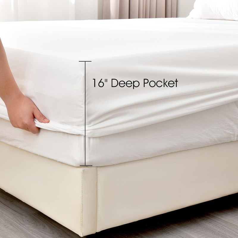 - 16" DEEP POCKET: This sheet features a 16" deep pocket with all-round elastic. With full and reinforced elastic band at backside, it will safely and securely cover your mattress, avoid it from slipping or move. It's our mission to ensure you a carefree night!