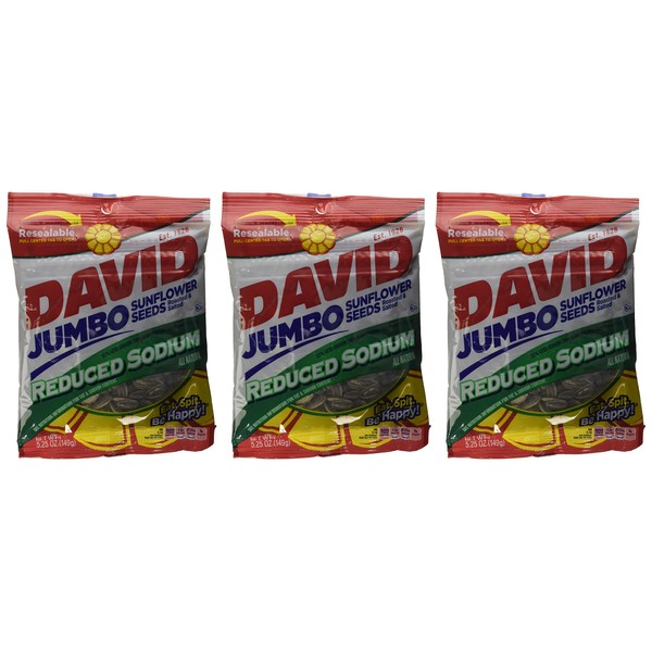 - 3 5.25oz bags of DAVID Jumbo Reduced Sodium Sunflower Seeds