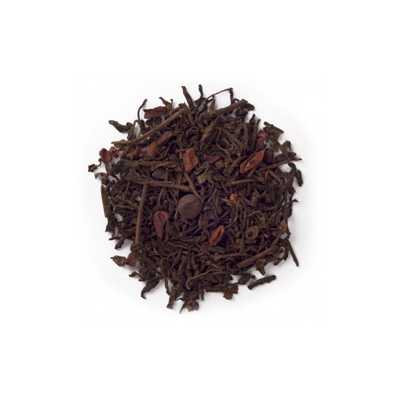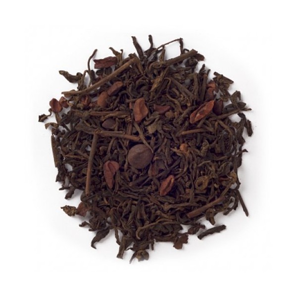 - A rich and fudgy blend of pu’erh, black tea, cocoa nibs and chocolate.