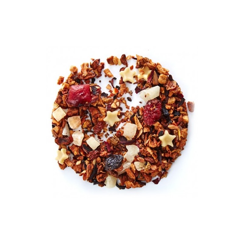 Apple (apple, citric acid), papaya, raisins, cranberries, el derberries, hibiscus blossoms, white chocolate (sugar, cocoa butter, milk powder, sunflower lecithin), stevia extract, natural cranberry and chocolate flavouring.