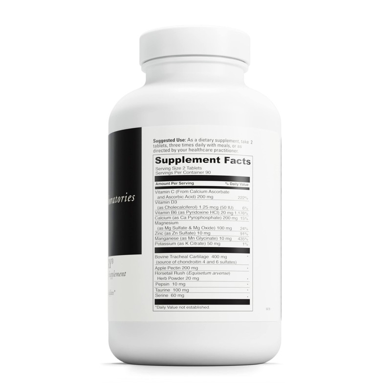 Vitamin C (From Calcium Ascorbate and Ascorbic Acid) 200 mg 222%, Vitamin D3 (as Cholecalciferol) 1.25 mcg (50 IU) 6%, Vitamin B6 (as Pyridoxine HCl) 20 mg 1,176%, Calcium (as Ca Pyrophosphate) 200 mg 15% Magnesium (as Mg Sulfate & Mg Oxide) 100 mg 24%, Zinc (as Zn Sulfate) 10 mg 91%, Manganese (as Mn Glycinate) 10 mg 435%, Potassium (as K Citrate) 50 mg 1%, Bovine Tracheal Cartilage 400 mg *(source of chondroitin 4 and 6 sulfates), Apple Pectin 200 mg *, Horsetail Rush (Equisetum arvense) Herb Powder 20 mg *, Pepsin 10 mg *, Taurine 100 mg *, Serine 60 mg *. *Daily Value not established. Other ingredients: microcrystalline cellulose, stearic acid, vegetable stearate, pharmaceutical glaze.