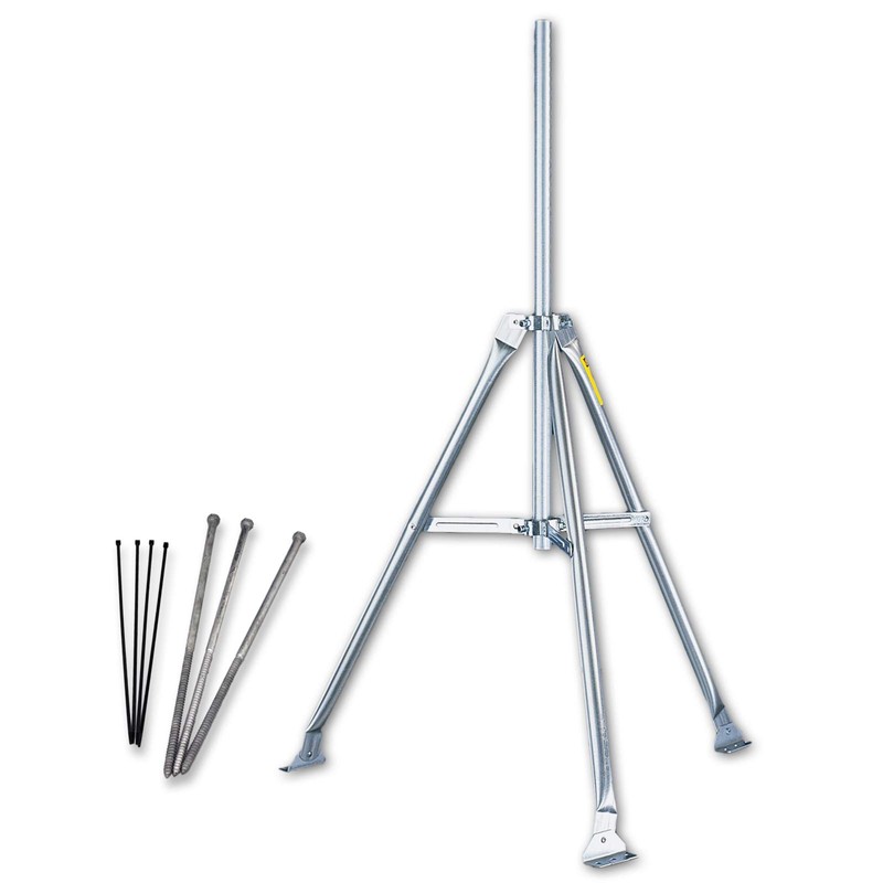 • Includes two poles and galvanized steel tripod with tilting brackets on the base to mount on a roof or uneven surface, and three 18" (0,5 m) lag bolts for ground installation.
