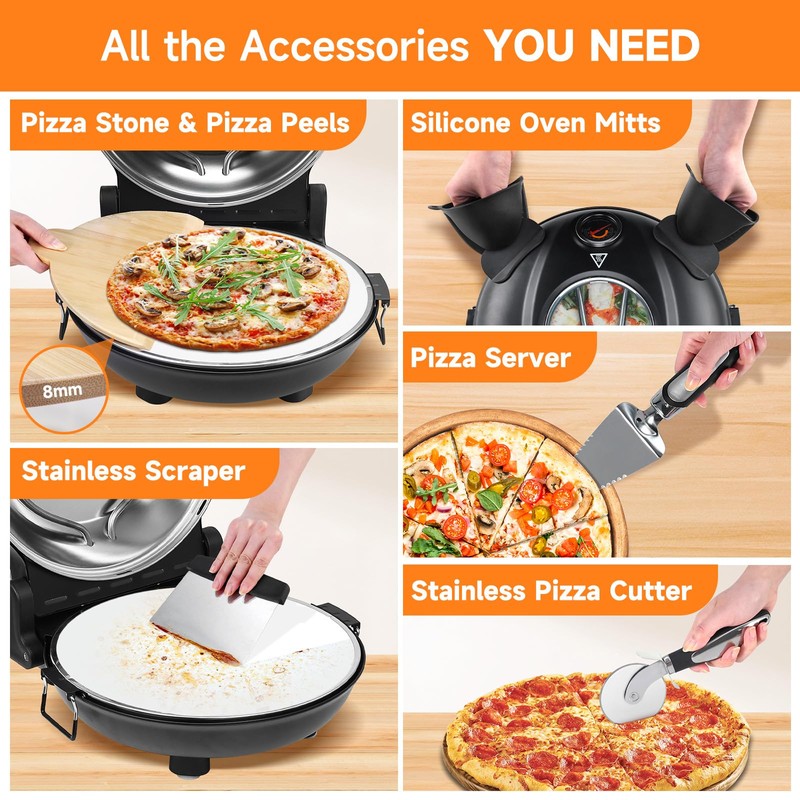 - ★【7-in-1 Package with Pizza Kits】Comes with all essential accessories you need: Electric Pizza Oven / Pizza Stone / Stainless Pizza Cutter / Wooden Pizza Peels / Scraper / Oven Mitts / Pizza Server. You can change different plates to cook a variety of recipes you like, Davivy pizza oven goes more than pizzas. Portable electric machine for easy carring and storage. Pizza oven dimensions: 13.4"L x 13.0"W x 6.5"H. Rated voltage/frequency/power: 120v~60Hz / 1200w