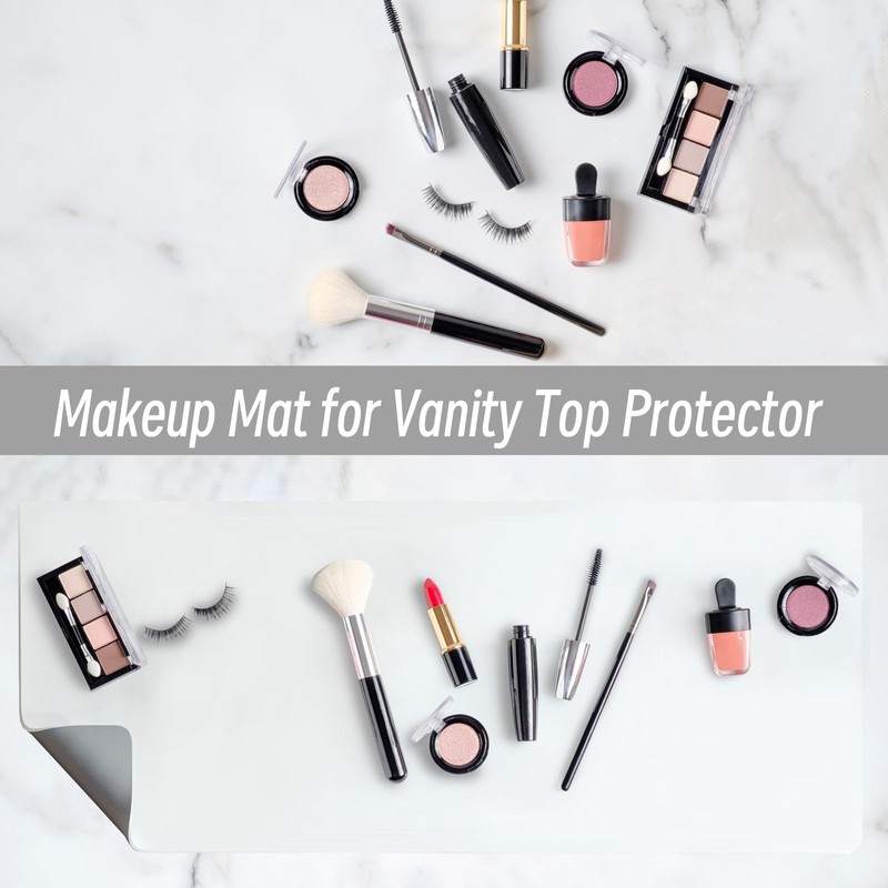 DAWNTREES Makeup Mat for Vanity,Dual-Sided Leather Vanity Mat, Easy to Clean, Waterproof and Oilproof,Desk Pad Mat to Protect Vanity(White - Silver)