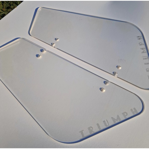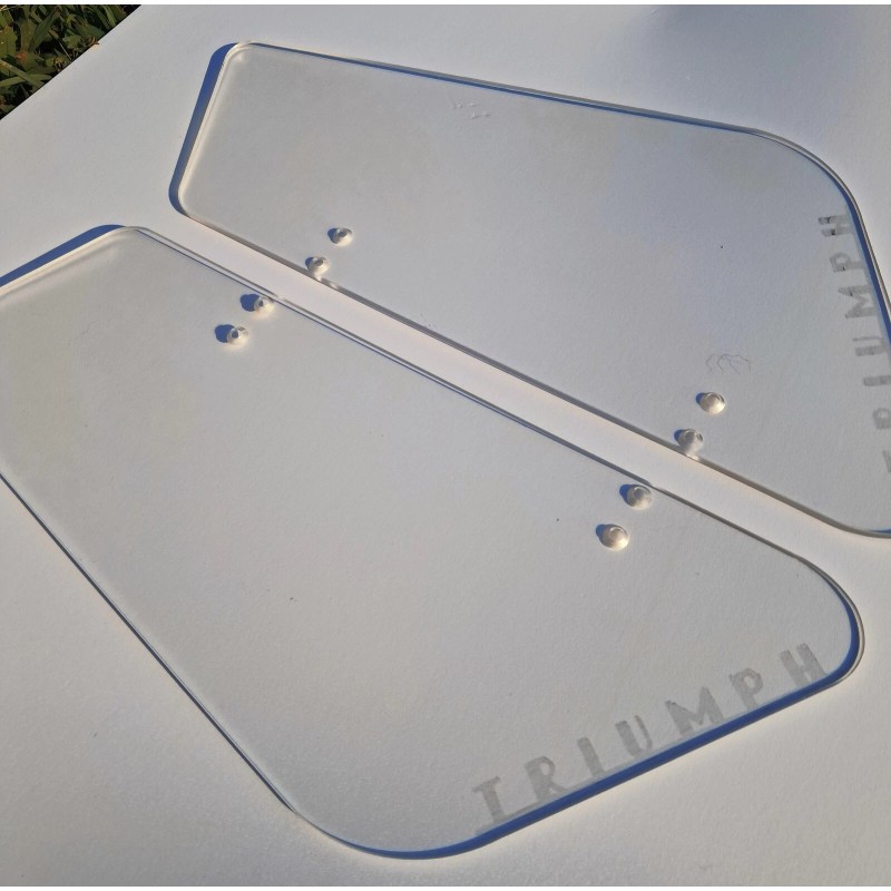 TRIUMPH TR2, TR3, TR3A, TR3B 1953-1962 NEW REPLACEMENT WINDWING SET *CLEAR* These are clear Plexiglass panels. Laser etched TRIUMPH logo across the bottoms. They are installed without drilling and are compatible with side curtains. Set of 2 made of crystal clear, durable 3/16" clear acrylic. Hardware not included. Left and right sides.