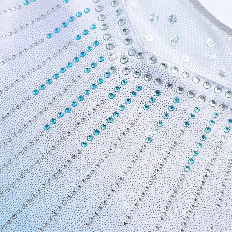 - Gymnastics leotards Design : covered in sparkly ice-blue and silver rhinestones, stretchy and covered in fancy sequins. Gradient color change is another feature of the leotards. extremely fairy-like and fantastic