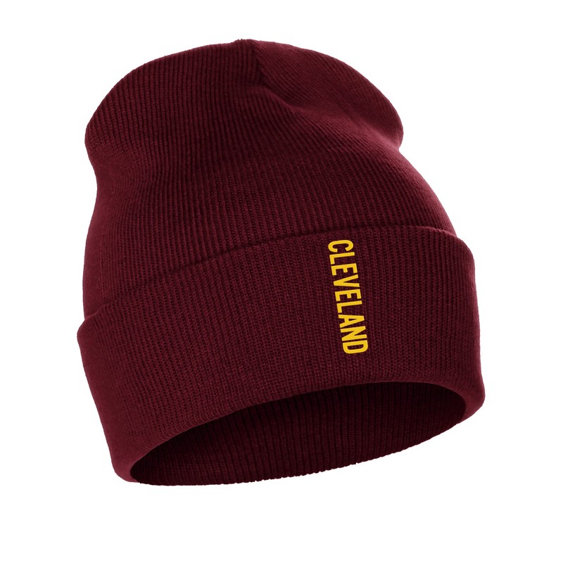 Daxton Vertical USA Cities Cuffed Beanie Winter Knit Hat Skully Cap, Cleveland Burgundy Gold