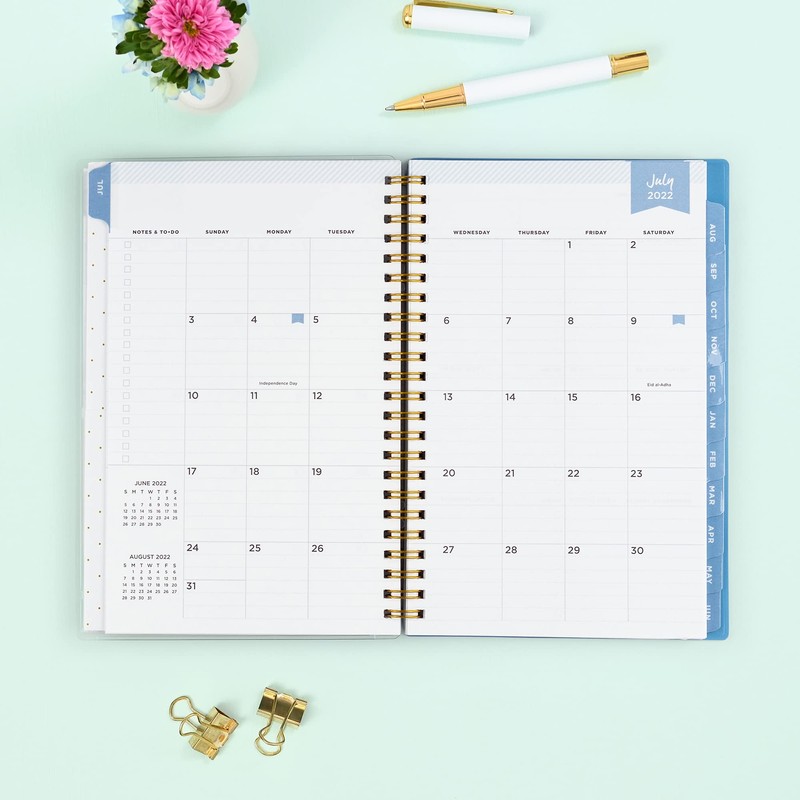 - Monthly calendar view per two-page spread offers a visual overview of your time for long-term planning, reference calendars and a notes section for important projects and reminders