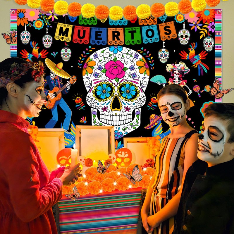 Day of The Dead Decorations - Dia De Los Muertos Ofrenda Set Include Mexican Sugar Skull Backdrop, Tablecloth, Marigold Flowers and Felt Papel Picado