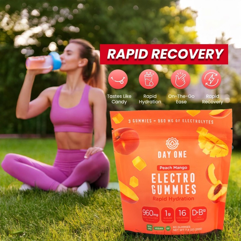 Day One ElectroGummies – Electrolyte Hydration Gummies – Ideal to Boost Hydration & Energy – Supplement for Post & Pre Workout – for Men, Women, Kids – Peach Mango Flavored – 60 Gummies
