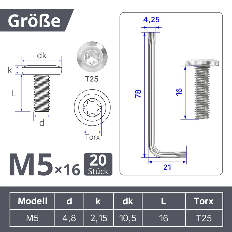 Dayalo Dayalo Edelstahl Schrauben M5x16mm Flachkopfschraube, Torx Schrauben Edelstahl A2 V2A Maschinenschrauben Vollgewinde, 20 Stck, Gewindeschrauben mit Torx Schlssel