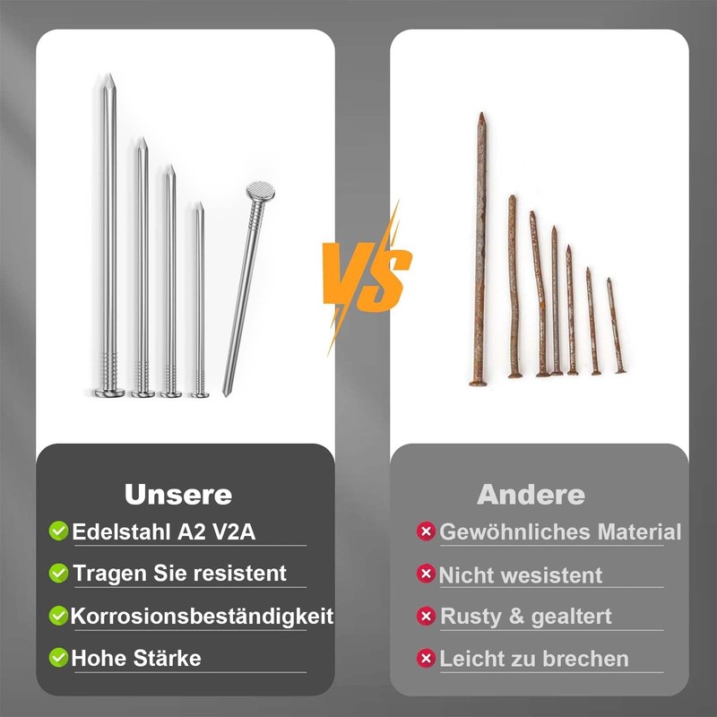 - High-quality material: the nails are made of high-quality A2 V2A stainless steel, have good hardness, corrosion resistance and rust resistance and are weakly magnetic, making them more robust and less prone to bending and breaking