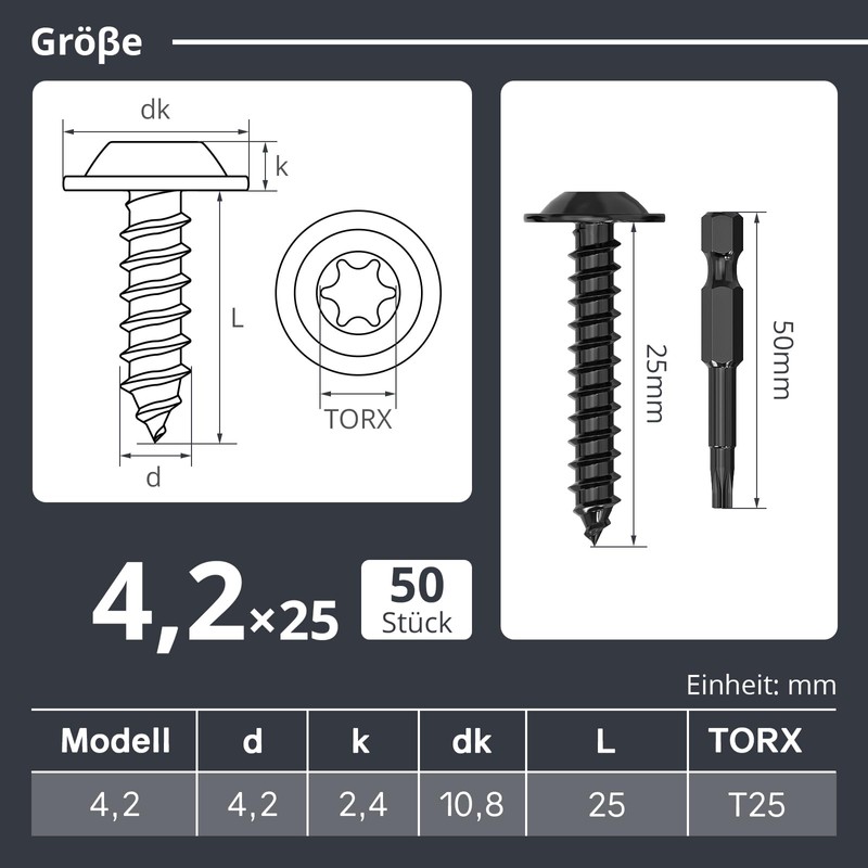 Dayalo Pack of 50 self-tapping screws, 4.2 x 25 mm, black, stainless steel flat head with disc Torx screws, self-tapping screws, drilling screws, wood screws, lens head, fully threaded, with drill