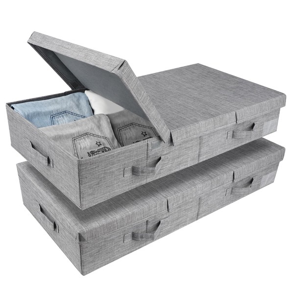 - These underbed storage bins are allowing you to have an extra storage space for organizing, neat and tidy. The storage box has 4 handles, and the flip cover designed which can be opened in three folds. They provide you a convenience to pull out and pick up easily. Firm foldable bottom and sidewalls make the box sturdier and more stackable, not easy to deform. In addition, 2 labeling windows make the storage and sorting simple and visible.