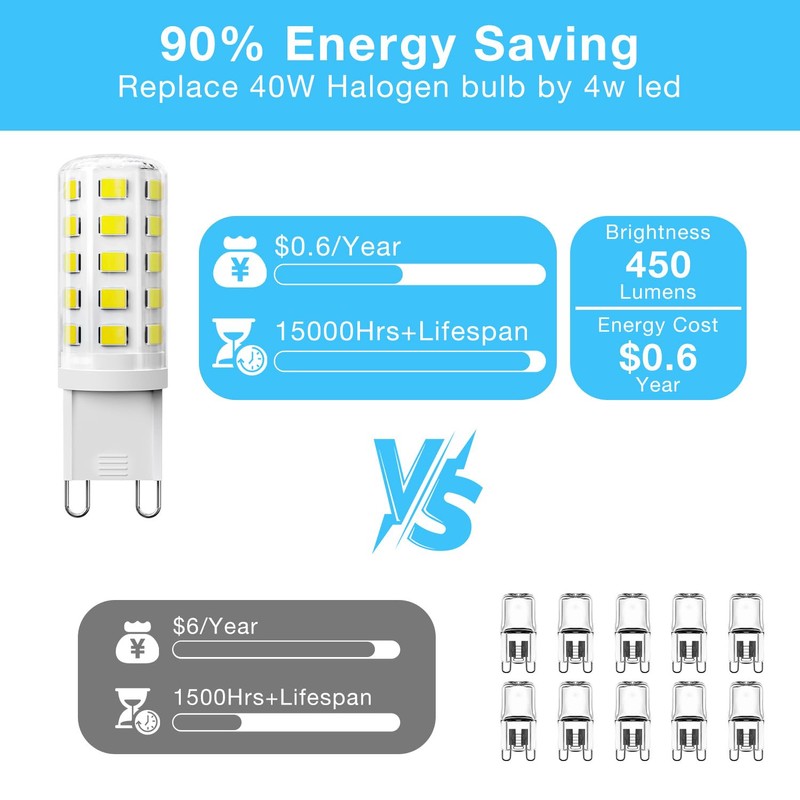 - 【Save Energy & Money】Replace 40W G9 halogen bulbs with 4W G9 Led bulbs, largely saving energy per year, the G9 will save up to 90% on the electric bill of lighting.