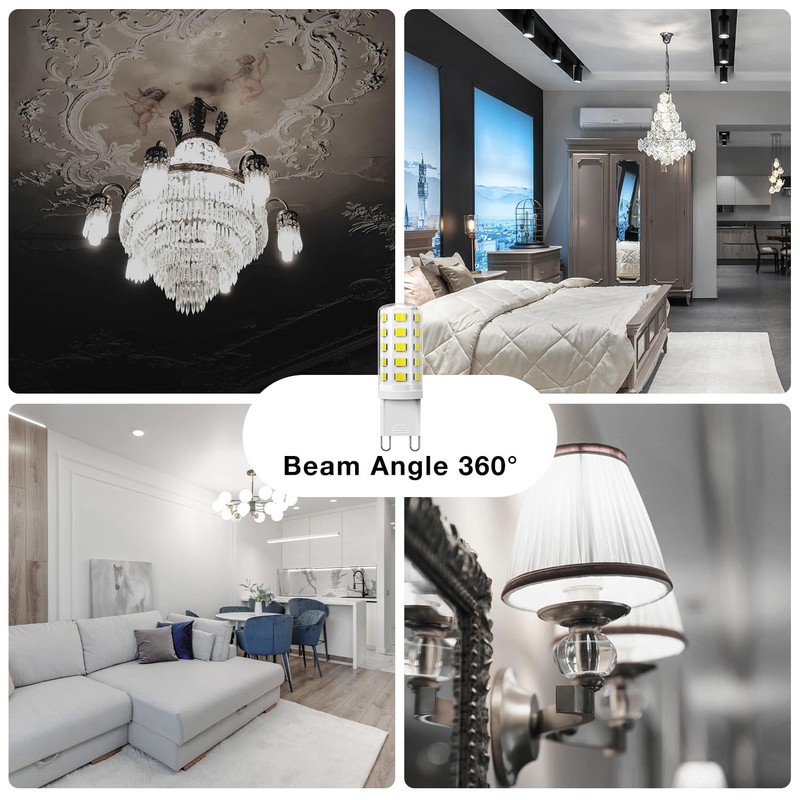 - 【6000K Soft Warm and 360° All-Around Lighting】 At 4 watts, it emits a soft white output of 450 lumens and a color temperature of 6000K in 360 degrees, which provides you with a broader, stabler and clearer lighting experience without blind corners or shadow. Our G9 bulbs color rendering index>85, restore the true and clear color of the item.