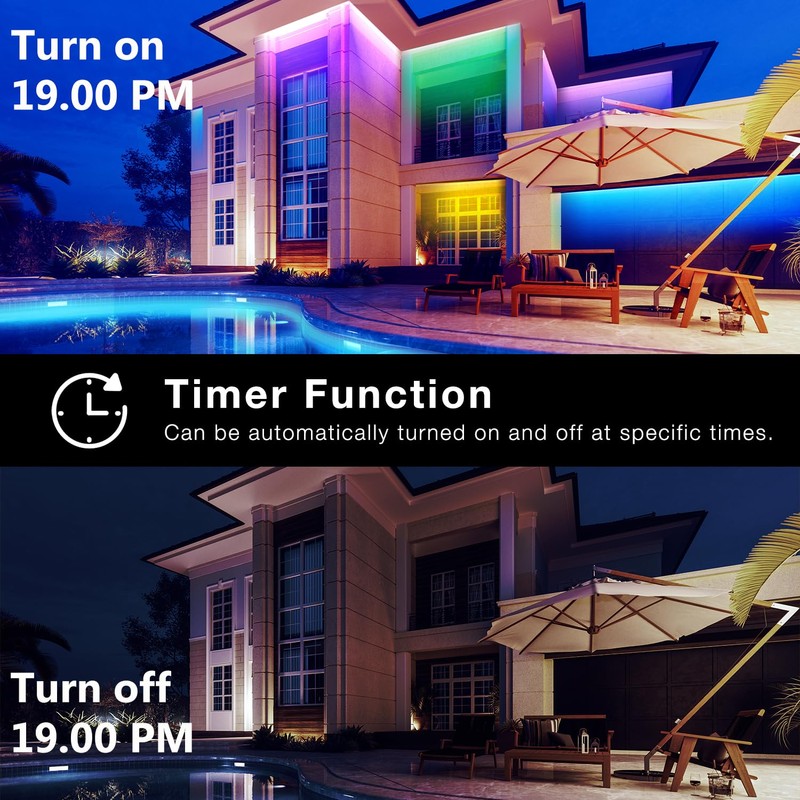 - Easy Installation : The smart LED strip lights outdoor can be installed conveniently with back adhesive for outdoor patio decorations. The included clips allow you to easily fix the waterproof LED strip lights outdoor on the porch or under the eaves