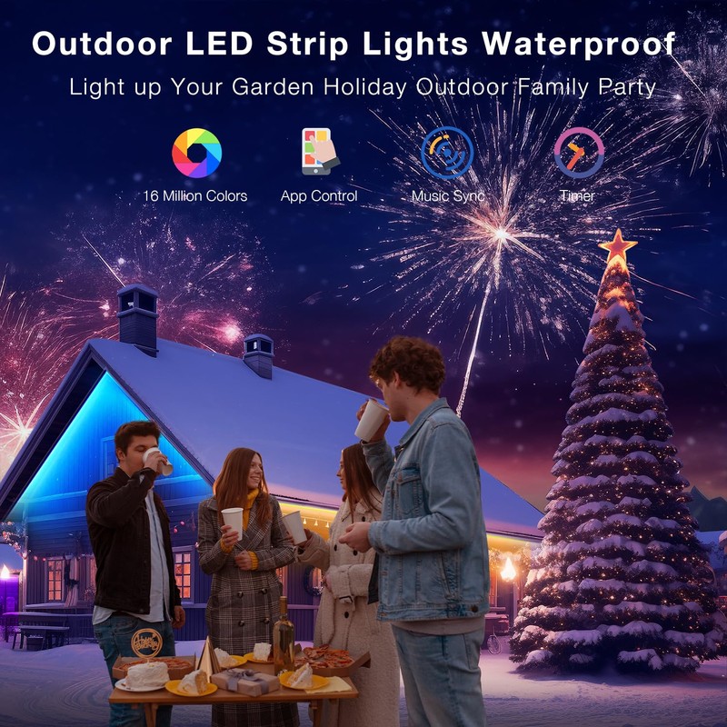 - Sync with Music : As patio decorations outdoor, the built-in mic allows the LED strip lights outdoor waterproof to sync to any music type. Let your party lights dance to your favorite songs. Light up your house for dynamic music mode.Christmas decorations