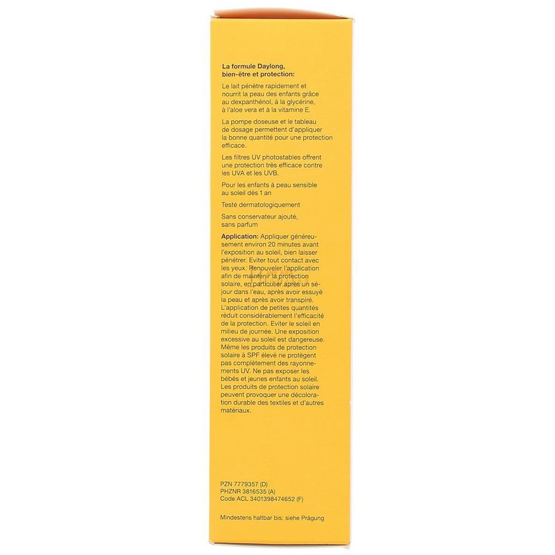 Daylong & # 8482; kids 'Lotion SPF 50 + is a liposomale Sun Protection Lotion, specially designed for children (skin types 1 and 2). Nourishing ingredients such as glycerin and Dexpanthenol to keep against the delicate baby skin additional moisture. The practical Dosierdispenser helps to determine the recommended amount (2 mg/cm & # 178;) to use, and to reach by designated Sun Protection Factor. Daylong & # 8482; kids 'SPF 50 is extra water and thanks to its highly effective UVA and UVB protection Extra Protective for the children's skin from the sun.