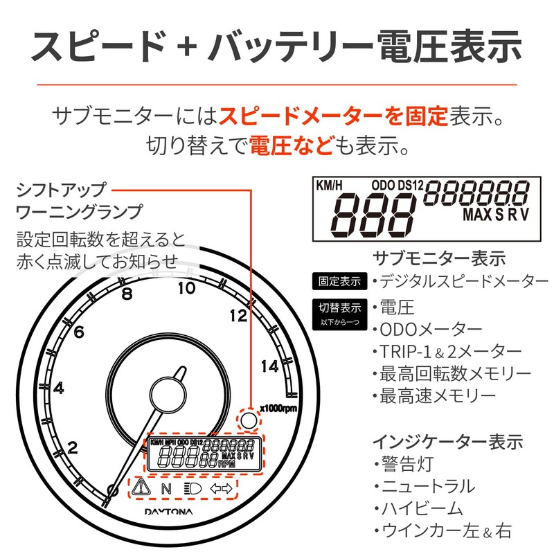 - Diameter 80 body 15,000 rpm display tachometer (needle) and speedometer (LCD)