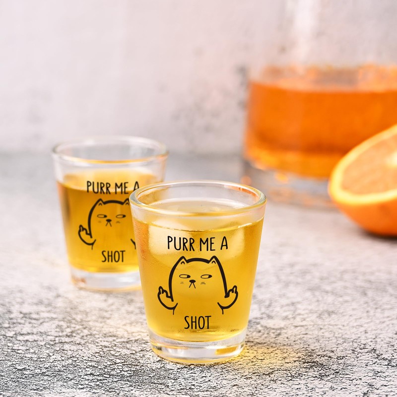 - FUNNY DESIGN: We designed a cute kitten and the words "Purr Me a Shot Glass" on the glass. This humorous and fun design will bring more joy to your drinking!
